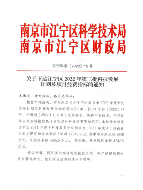 近日,南京市江寧區(qū)科技局和財(cái)政局下達(dá)了2022年度第二批科技發(fā)展計(jì)劃及項(xiàng)目經(jīng)費(fèi)指標(biāo),本批計(jì)劃涉及江寧區(qū)2021年規(guī)上科技服務(wù)企業(yè)獎勵資金、2021年度江寧區(qū)高企認(rèn)定兌現(xiàn)獎勵資金等736項(xiàng)共計(jì)17548萬元。