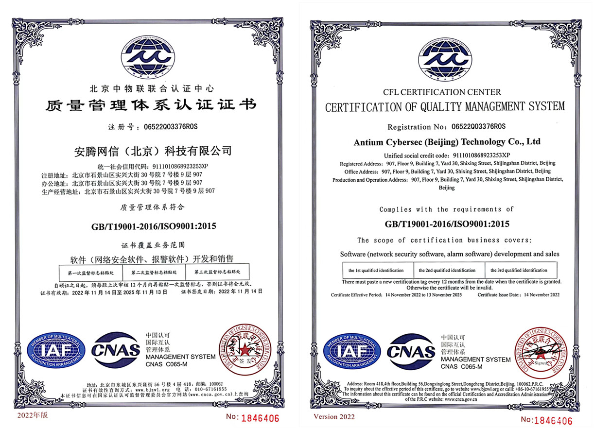 2022年11月15日,安騰順利通過了北京中物聯聯合認證中心的專項審核,正式獲得了GB/T19001-2016 / ISO 9001:2015質量管理體系認證證書,標志著安騰在公司管理正規化方面取得了新的進展,有利于提高公司產品質量的可靠性和穩定性,認證范圍包括:軟件(網絡安全軟件、報警軟件)開發和銷售。
