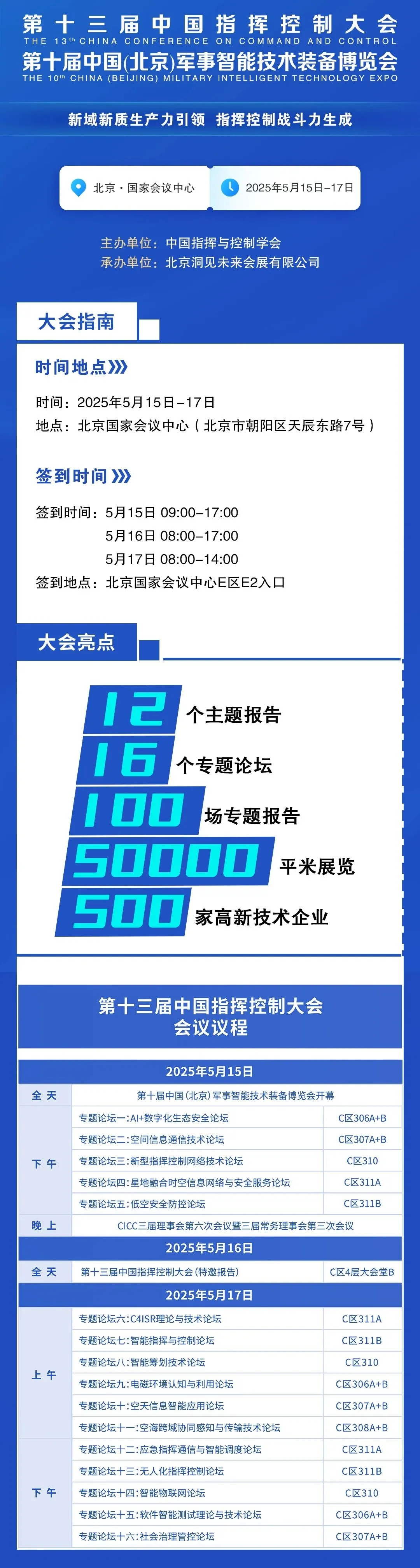“中國指揮控制大會”是目前我國指揮控制領域內每年一次的高端盛會,是集學術交流、產品展示、專題研討于一體的全國性、綜合性活動。同期舉辦“中國(北京)軍事智能技術裝備博覽會”。屆時將邀請政府、軍隊、武警、公安、交通、人防、航天、航空、兵器、船舶、電科集團等從事國防軍工技術與產業領域的數萬名代表到場參加。
