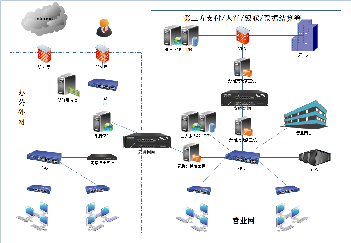 銀行是安全水平要求極高的行業,需要確保網絡信息的完整性和正確性,尤其要防范外部惡性行為入侵銀行的網絡環境。本銀行同人民銀行及其他銀行進行結算及網上銀行等業務的開展,使銀行內部網絡面臨眾多威脅。